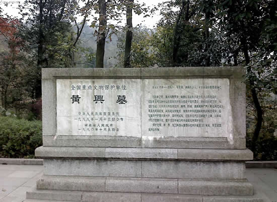 在岳麓山上。墓由三層臺階百余級踏步導(dǎo)入,墓碑為一四棱形的整塊4乳白色巖石琢成,全高約10米,因地處岳麓山高峰開闊處,顯得格外聳拔、挺秀、眺望湘江江,長沙景物盡入眼底。黃光(1874—1916),朱名軫,號杞園,又號克強,湖南善化(今長沙)人,辛亥革命重要領(lǐng)導(dǎo)人,史有“孫黃”之稱。1904年組織華興會,翌年8月與孫中山、章太炎等人組織中國同盟會,曾生動并領(lǐng)導(dǎo)欽州、廉州(治今廣西合浦)、鎮(zhèn)獻(xiàn)花(今友誼關(guān))、河口、廣州等地區(qū)反清戰(zhàn)役起義,任民軍戰(zhàn)時總司令。南京臨時政府成立,任陸軍總長。袁世凱稱帝后,任討袁軍總司令。1914年赴美醫(yī)病,1916年病重回國,10月31日于上海病故,時年43歲,次年移柩長沙,國葬于岳麓山。為全國重點文物保護單位。