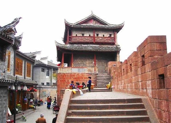 鳳凰北門古城樓圖片 到清朝,古城的軍事地位日顯重要,先后在這里設鳳凰廳、鎮(zhèn)竿鎮(zhèn)辰沅永靖兵備道治所,古城的建設也得到加強?滴跷迨哪辏1715年)遂將磚城改建為石城,北門定名為“壁輝門”,一直保存至今。北門古城樓采用本地紅砂條石筑砌,做工考究,精鉆細琢。城門呈一半月拱,有兩扇鐵皮包裹。圓頭大鐵釘密鉚其上的大門。城樓用青磚砌筑,重檐歇山頂,穿斗式木結(jié)構(gòu),石座卷頂。城樓對外一面開槍眼兩層,每層4個,能控制防御城門外一百八十度平面的范圍。北門城樓與東門城樓之間城墻相連,前臨清澈的沱江,既有軍事防御作用,又有城市防洪功能,形成古城一道堅固的屏障,雖幾經(jīng)戰(zhàn)火,仍巍峨聳立于沱江河岸。 |
