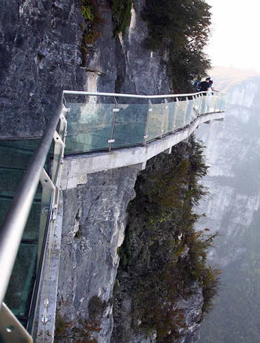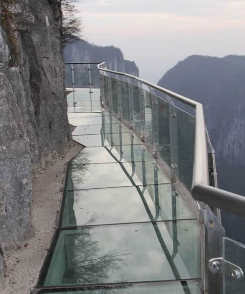 2011年10月1日,張家界天門山國家森林公園新建的玻璃棧道正式對游客開放。玻璃棧道懸于天門山頂西線,長60米,最高處海拔1430米。是張家界天門山景區(qū)繼懸于峭壁之上的鬼谷棧道、憑空伸出的玻璃眺望臺(tái)、從玻璃臺(tái)可以看見下面。玻璃臺(tái)伸出棧道有4-5米,專供游人拍照、橫跨峽谷的木質(zhì)吊橋后打造的又一試膽力作。為了讓游客零瑕疵的透過玻璃橋看到美麗的風(fēng)景,上橋的游客均要求戴上鞋套,以保持玻璃橋的透明和干凈。玻璃棧道的刺激震撼,可與舉世聞名的美國大峽谷玻璃走廊“天空之路”媲美,因而有了東方“天空之路”的美譽(yù)。