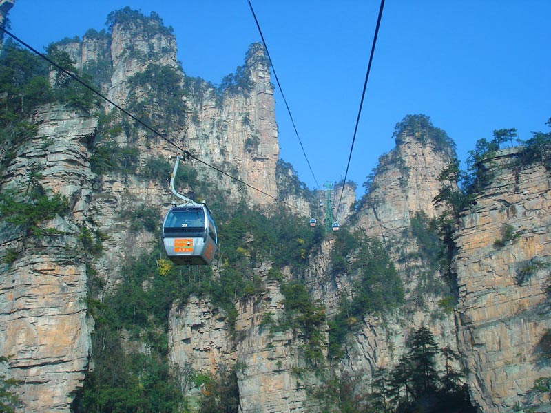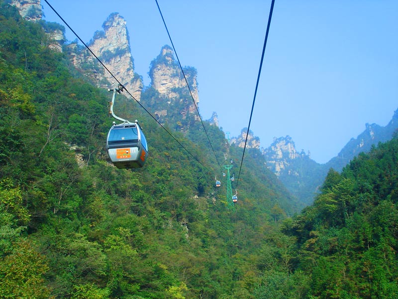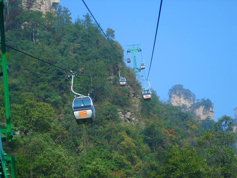 天子山索道 天子山索道的建成開通,極大地改善了武陵源風(fēng)景區(qū)的旅游交通環(huán)境,使游人花半日功夫上得天子山來只看一眼的遺憾,變成了間歇飛渡上山便可盡覽天子山這“擴(kuò)大的盆景,縮小的仙境”的迷人景色之享受。乘坐天子山索道,既舒適又安全,沿線風(fēng)光奇絕,奇松怪石,莽莽翠林,幽幽泉水,嬉戲獼猴,盡收眼底,令人嘆為觀止。尤其在云霧繚繞之時,游客乘坐索道更能體驗到神仙飄逸飛行的動感與刺激。