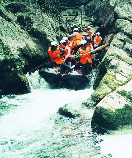 西門峽 西門峽漂流全程6公里,屬萬溶江流域,它發(fā)源于兩頭羊自然保護區(qū)的群山之中;沿途危崖夾峙,樹木蔥榮,水質(zhì)清澈、急流、險灘星落棋布。共有虎跳澗、白龍灘、臥龍灘、青龍峽、鬼見愁、龍王灘等急流險灘30余個。其中以青龍灘最為著名,它全長400米,落差20余米。它和龍王灘一道堪稱國內(nèi)漂流之經(jīng)典。