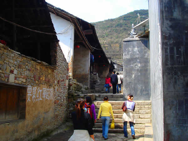 苦竹寨 賀龍在桑植革命時期,幾乎踏遍了澧水兩岸的山山水水,村村寨寨?嘀裾清⑺叺囊蛔贁(shù)民族雜居的村落,保留了明清時的建筑特色,民風(fēng)淳樸,村民能歌善舞,許多桑植民歌都是靠苦竹寨的歌手流傳的。入夜的時候,苦竹寨亮起了盞盞紅燈,這是村里的一個傳統(tǒng)。當(dāng)年紅軍夜行軍過苦竹寨的時候,村里有個老婆婆怕紅軍夜黑路難走,便在家門口懸起了一盞紅燈,其它村民爭相效仿,苦竹寨成了一個燈的世界。這段軍民魚水情被寫成了歌,傳唱到現(xiàn)在,這就是《門前掛盞燈》。