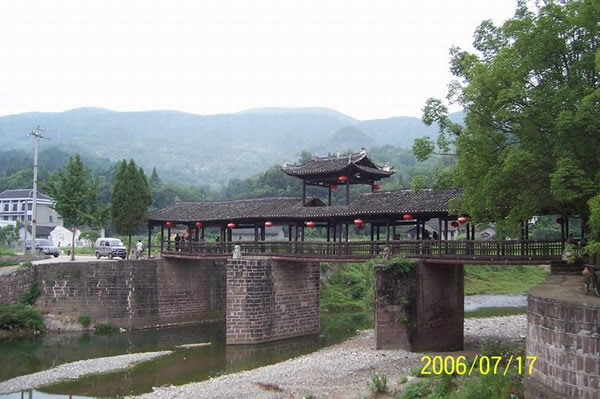 | 賀龍橋原名永安橋,是賀龍?jiān)娓纲R廷宰首倡修建的,它是一座由石墩、木梁、騎廊組成的風(fēng)雨橋。賀廷宰熱心公益事業(yè),見玉泉河“奔流湍急,道路為梗”,行人十分不便,于是決定修橋。由于他只是一個(gè)教私塾的文人,修橋工程艱巨,個(gè)人經(jīng)費(fèi)有限,“至斥腴畝以償其負(fù)”。后來,賀龍的祖父賀良仕子代父勞,費(fèi)盡心血,終于在1915年修建成功,深獲遠(yuǎn)近鄉(xiāng)鄰稱頌。