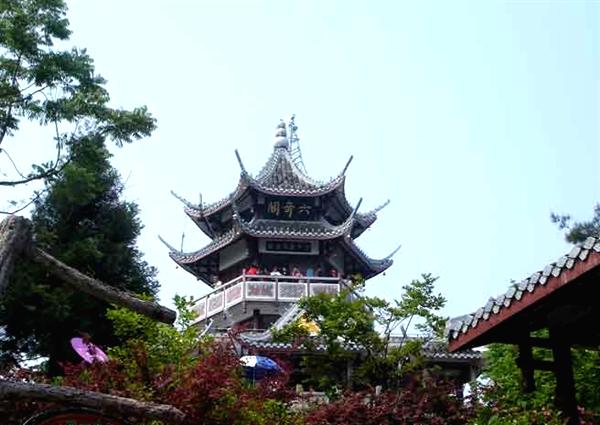 | 六奇閣位于張家界森林公園黃石寨項的人工建筑。因張家界國家森林公園”山奇、水奇、云奇、石奇.樹奇以及珍禽異獸之奇”而得名。閣分3層,黃瓦蓋頂,飛檐翹角,畫梁彩棟,回廊石欄。登閣憑眺,滿目佳景。閣柱楹聯(lián)日:“翠鬟煙籠,綠樹云封.昔日曾遮半個面:麗質(zhì)天生,畫圖省識,今朝始醉四方人!庇忠宦(lián)云“名動全球,到此實堪三擊掌:勢拔五岳,歸來不用再看山!遍w內(nèi)設(shè)有土家風情歌舞樓.竟日絲竹弦管,清音繞梁。閣基嵌有《張家界國家森林公園記》全文碑刻。1995年9月8日.全國政協(xié)主席李瑞環(huán)登閣賞景。