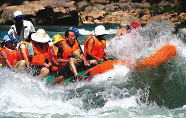 茅巖河漂流 茅巖河不僅是水的彩圖,也是山的國畫。兩岸青山綿延,萬木蔥籠,峭壁對峙,溝深谷幽,洞穴密布。刀削似的峭壁上古松斜掛。老鷹、烏鴉、黃雀成群盤旋于峰尖,嗚叫于峭壁。