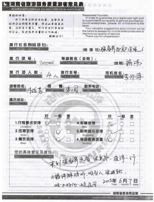 5月下旬,上海張女士一行四位貴賓與湖南西部(張家界)中國國際旅行社工作人員——龔玲取得聯(lián)系,經(jīng)過商談,雙方達成協(xié)議并簽訂旅游合同,于6月4日抵達張家界,開始張家界之旅。此次行程是由我社優(yōu)秀導(dǎo)游——褚偉,負責(zé)旅游接待工作,褚導(dǎo)在旅游過程中講解詳細,客人也很滿意,在意見表上寫到:來到張家界感覺很意外,值得一行,小褚講解動聽,吸引人,很幽默!同時也感謝張女士選擇湖南西部(張家界)中國國際旅行社,以及您對湖南西部國旅的信任與支持。我們會繼續(xù)努力,做好旅游接待工作。期待下一次與您的合作,祝您愉快!