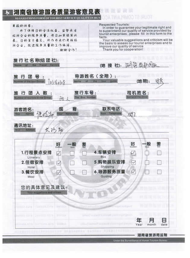 1月份,長沙舒錦一行21位貴賓與湖南西部(張家界)中國國際旅行社工作人員——張群取得聯(lián)系,經(jīng)過商談,雙方達成協(xié)議并簽訂旅游合同,于1月8日抵達張家界,開始張家界之旅。此次行程是由我社優(yōu)秀導游——田杉負責旅游接待工作,田導在旅游過程中講解詳細,客人也很滿意。同時也感謝長沙舒錦一行貴賓選擇湖南西部(張家界)中國國際旅行社,以及您對湖南西部國旅的信任與支持。我們會繼續(xù)努力,做好旅游接待工作。期待下一次與您的合作,祝您愉快!
