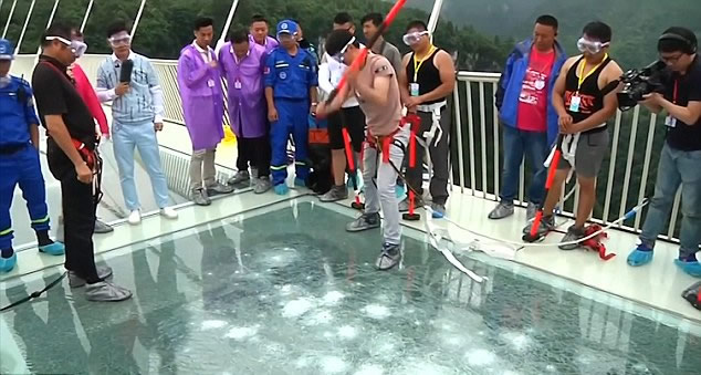 2015年12月20日,湖南張家界,張家界大峽谷景區(qū)董事長陳志冬打扮成圣誕老人的形象站在玻璃橋上,拉開向全球征集橋名一字一萬元的活動。