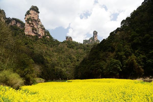據(jù)了解,這塊“黃金地”位于武陵源十里畫廊景點(diǎn)入口靠近索溪湖尾處,實(shí)乃一片沙洲地,景區(qū)居民種植的油菜正是花開季節(jié),猶如黃金灑滿大地。這塊色澤艷麗的“黃金地”,與近處清澈的溪水、嫩綠的水草,以及遠(yuǎn)處發(fā)芽的樹木、翠微的峰林一起,構(gòu)成一幅絕美天然的山水畫,為外界傳遞著武陵源濃濃的春意。