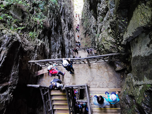 天梯棧道的木板很窄,依次往下延伸,就像一架天梯,把我們送往迷人的仙境。這道“天梯”不是天賜的,而是靠了當(dāng)?shù)氐纳矫,腰系繩索,手扶峭壁,肩扛背馱,將這些堅(jiān)硬而沉重的石頭從山頂一塊一塊地運(yùn)來、鋪好,鋪成現(xiàn)在這條看似險(xiǎn)峻、其實(shí)結(jié)實(shí)安全的1600多級石階棧道。
