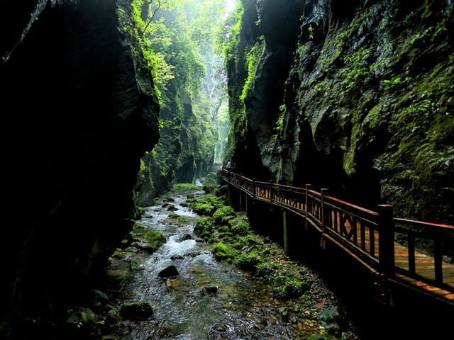 大峽谷在這一段猛然一下子收縮了,變得越來越窄了。這段很窄的峽谷叫做神泉峽,總長300余米。在神泉峽,我們要穿過兩處水簾瀑。