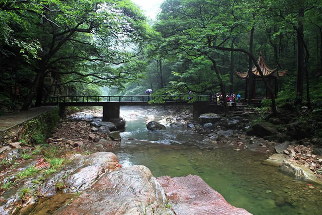 在千里相會(huì)東約250米處,有數(shù)十座翠峰環(huán)列鎖住了一塊長(zhǎng)200多米、寬30多米的溪谷。谷內(nèi)群峰排列如屏,鱗次櫛比,相對(duì)高多在200米以上,峰體或丹巖熠熠,或灌木叢生,或古松高掛。澗壑幽邃,清溪漫流。內(nèi)有猴群攀緣,角雉啼鳴,一石擊水,四壁回音。朝陽(yáng)從峰隙中射入三五道銀光,如一柄柄長(zhǎng)劍刺入溪谷老林,光怪陸離。若遇陰雨,霧繞云蓋,一片幻影。