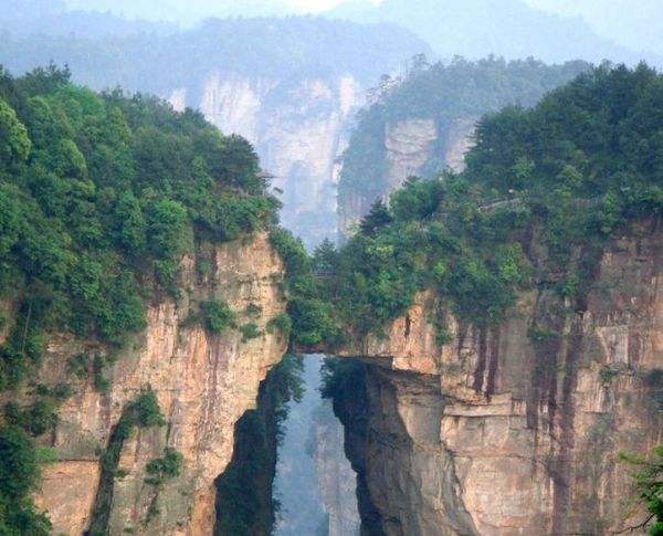 “后花園”至天下第一橋,有一條全長(zhǎng)2000多米的游道,路面多為白色的條石鋪成,站在遠(yuǎn)處觀望,很像一條白色的綢帶打了兩個(gè)結(jié),一頭系在“迷魂臺(tái)”,一頭第在“天下第一橋”。信步漫游,沿途可欣賞到“拜仙臺(tái)”、“百丈絕壁”、“小洞天”、“情人谷”等別有情趣的景點(diǎn),這里海拔不高,一般不受氣候影響,慢慢品味,定會(huì)使您賞心悅目!疤煜碌谝粯颉笔菑埣医纭笆蠼^景”之一。也是袁家界的標(biāo)志性景點(diǎn),它是居于兩山之間形成的一座天然石橋,而兩山原為一體,橋身是兩山相連的關(guān)鍵部分,但因中間石質(zhì)較為薄弱,由于風(fēng)化、崩塌作用的影響,又經(jīng)過(guò)日曬雨淋、流水洗刷、山洪沖擊,久而久之,終于形成今天這一特別的奇景……。自杉刀溝上袁家界,沿絕壁頂部邊緣遨游,至于中坪“觀橋臺(tái)” 遙望千米之外,只見(jiàn)一天然石橋凌空飛架兩峰之巔,氣勢(shì)磅礴,奇?zhèn)ソ^倫,被稱(chēng)為“天下第一橋”。石橋?qū)拑H3米,厚5米,跨度約50米,相對(duì)高度近400米。天下第一橋與夫妻巖并稱(chēng)“張家界雙絕”!疤煜碌谝粯颉睒蛎鎸拑擅,厚四米,跨度為二十多米,高度為三百多米,是世界是迄今為止所發(fā)現(xiàn)落差最高的天然石橋。