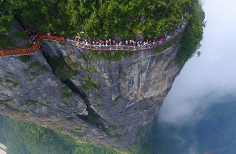 站在棧道上俯瞰群山,古人“會(huì)當(dāng)凌絕頂,一覽眾山小”的感覺(jué)油然而生。由于天門(mén)山是國(guó)家森林公園,植被特別豐富,加上典型的喀斯特地貌,所以,在這條棧道上更能找到一種在乘坐直升飛機(jī)飛越熱帶雨林大峽谷的感覺(jué),這平時(shí)只能在電影里看到的場(chǎng)景,在這里能讓你身臨其境。