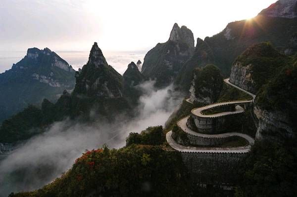天門(mén)洞以其接地通天的態(tài)勢(shì),成為人們心中通天的門(mén)戶(hù),而通往天門(mén)洞的盤(pán)山公路也因此被稱(chēng)為“通天大道”。更為神奇的是,在公路竣工的時(shí)候,人們驚奇地發(fā)現(xiàn),這條順山勢(shì)修建的通天大道剛好99個(gè)彎,暗合了“天有九重,云有九霄”之意。 通天大道以進(jìn)山時(shí)的標(biāo)志門(mén)為起點(diǎn),一直通達(dá)天門(mén)洞腳下,全長(zhǎng) 10.77 千米,但就在這么短的距離里,它的海拔卻從 200 米 急劇提升到了 1300 米,大道兩側(cè)絕壁千仞,空谷幽深,180 度的急彎此消而彼,層層疊起,“ 堪稱(chēng)天下第一公路奇觀 ”。中國(guó)書(shū)法協(xié)會(huì)常務(wù)副會(huì)長(zhǎng)沈鵬先生走過(guò)通天大道后欣然為其題字“曲道通天”,字體遒勁挺拔,與通天大道的奇絕天下相融為一體。通天大道于 1998 年開(kāi)始修建,因天門(mén)山獨(dú)特的地質(zhì)和氣候所局限,至 2005年全面貫通,歷時(shí)8年,共耗資 1 億元人民幣。整個(gè)工程充滿(mǎn)著艱辛卓絕,它凝聚著全體施工人員的智慧和心血,其勢(shì)驚險(xiǎn)奇絕,蕩氣回腸,以蜿蜒迂回穿行于山體絕壁之天險(xiǎn)而成為天下第一公路奇觀。